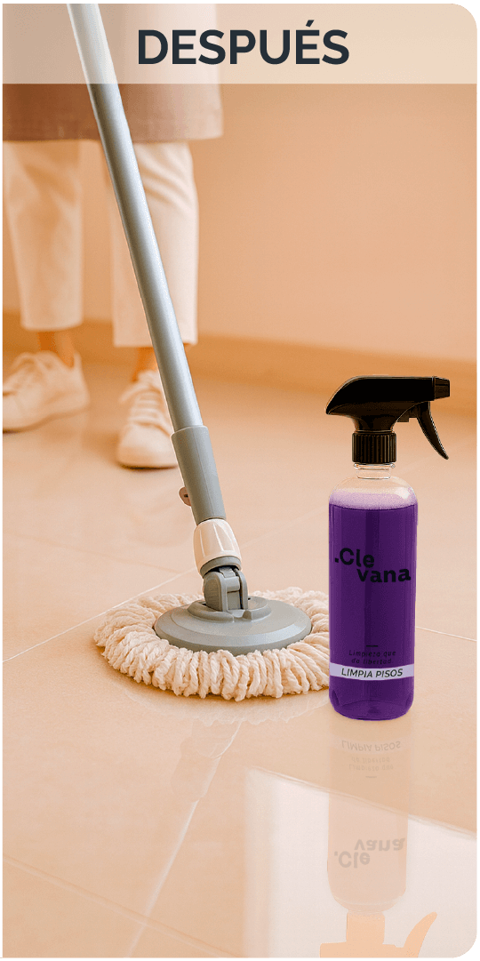 “Mi hijo gatea por toda la casa y antes evitaba usar limpiadores cuando él estaba cerca. Con Clevana siento tranquilidad. No huele fuerte, no irrita y todo queda impecable. Es un alivio real.”